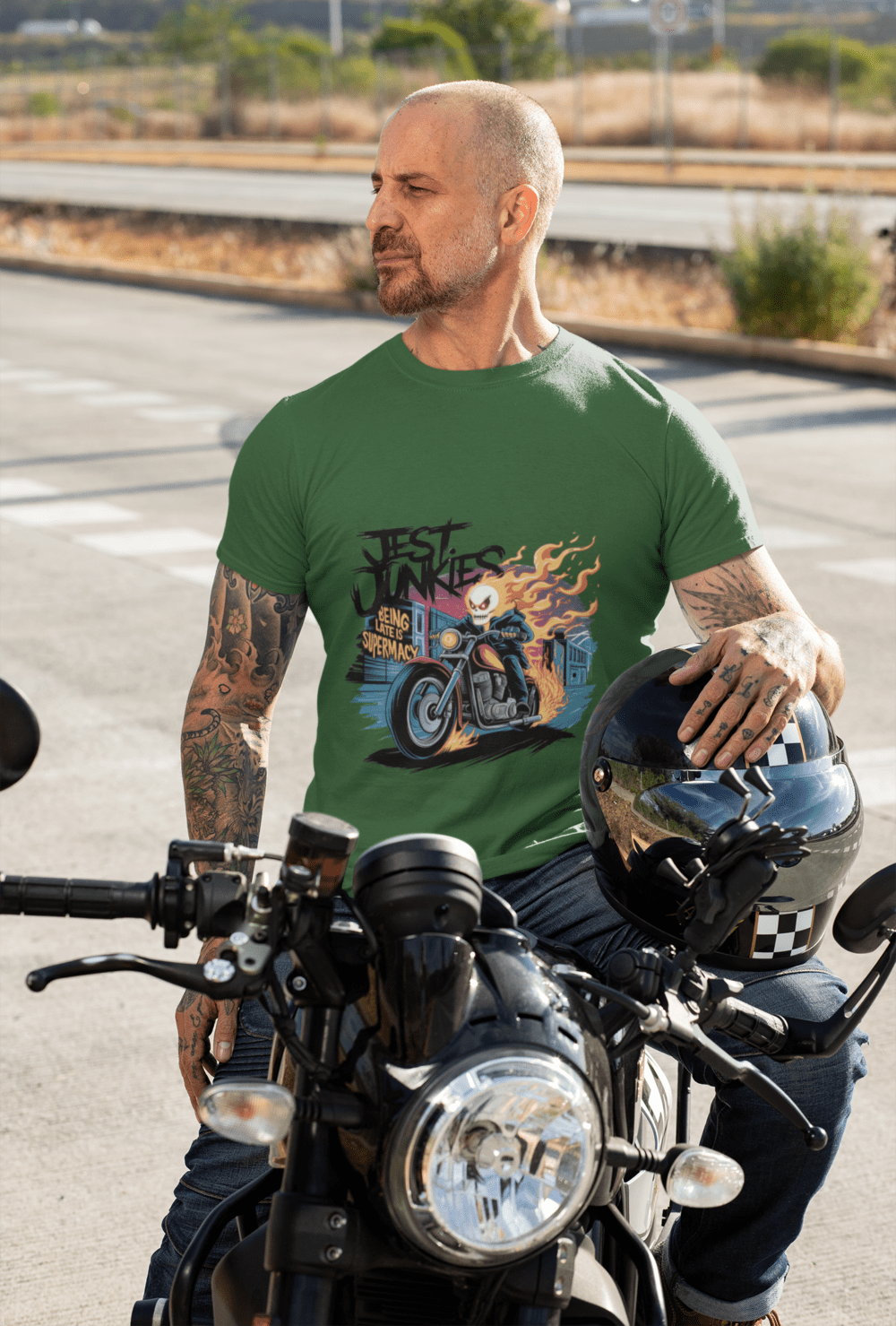 Revamp your wardrobe with the “Jest Junkies” Biker Being Late Is Supermacy Graphic T-Shirt – a premium cotton tee designed for style, comfort, and durability. Crafted from 180 GSM pure cotton, this unisex t-shirt is perfect for both men and women who want to showcase their love for motorcycles and the open road. With a bold, eye-catching design featuring a flaming motorcycle and a “Jest Junkies” logo, this t-shirt combines urban edge with biker spirit, making it a must-have for every motorcycle enthusiast in India.
